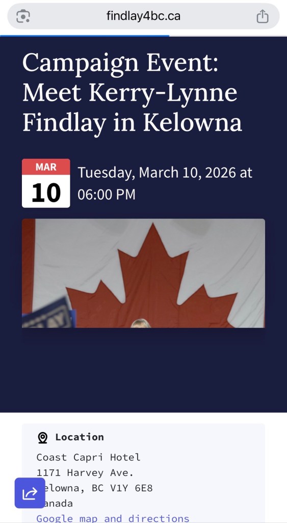 If you live in the Okanagan area, you are invited to register to meet your next BC Premier Kerry-Lynne Findlay who can get BC working again. The event is tonight, Tuesday March 10th, 6pm, at Coast Capri Hotel.