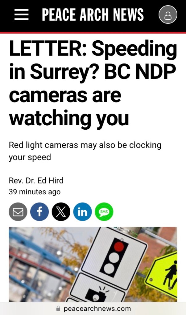 In 2023, over 26,000 BCers were charged over $5 million dollars in speed camera fees. Despite NDP denials, many see this as a cash grab reminiscent of the massively unpopular photo radar program imposed by the NDP in the 1990s. Either way, drive safely and watch your speed. The cameras are watching you. Rev. Dr. Ed Hird