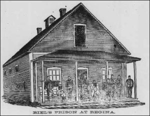 “Reporter: “I fear Col. Irvine is not friendly to the LEADER, which, in the public interest has felt bound to criticize him. However I must not enlarge on that head with you. My marching orders were to ‘See Riel,’ whom it was understood desired to see the Reporter of the LEADER with whom during his trial he frequently communicated.” Believing it useless to wait on the gallant Col, I repaired to the Queen City of the plains and went to my lodgings where I had the ‘Materials’ with which I had long been armed in preparation for this crisis. When first the officer in command of the LEADER said ‘An interview must be had with Riel if you have to outwit the whole police force of the North-West,’ I resolved various schemes. I reflected what great things had been done by means of the fair sex, and I thought, suppose I enlist on my side the fair ‘Saphronica’ and get her to put the ‘Comthethes’ on ‘Irvine’s susceptible fancy, and let her represent the LEADER. Saphronica was willing. A young lady of undoubted charms and resolute will, she essayed the officer in command, and, strange to say, his sense of duty or his fears of the Government, were stronger than his gallantry and Saphronica utterly failed to corrupt the guard. But on this, the Editor in chief frowned. At last I hit on a plan of my own. Accordingly on the evening of my refusal by Deane, I repaired to my lodgings, put on a soutaine (liturgical term for a robe) armed my chin with a beard, put on a broad brimmed wide awake, and stood Mr. Bienveillee the ancien confesseur of the doomed Riel. I hung at my bosom an enormous silver crucifix and now, speaking French, presented myself at the Barracks. The guard made no difficulty, and I believe they took me for Pere Andre. Entered his cell, I looked round and saw that the policeman had moved away from the grill. I bent down, told Riel I was a LEADER reporter in the guise of a pretre, and had come to give his last message to the world. He held out his left hand and touching it with his right, said: “Tick! Tick! Tick! I hear the telegraph, ah ca finira, “quick, I said, have you anything to say? I have brought pencil and paper — Speak”. Riel: “When I first saw you on the trial, I loved you.”