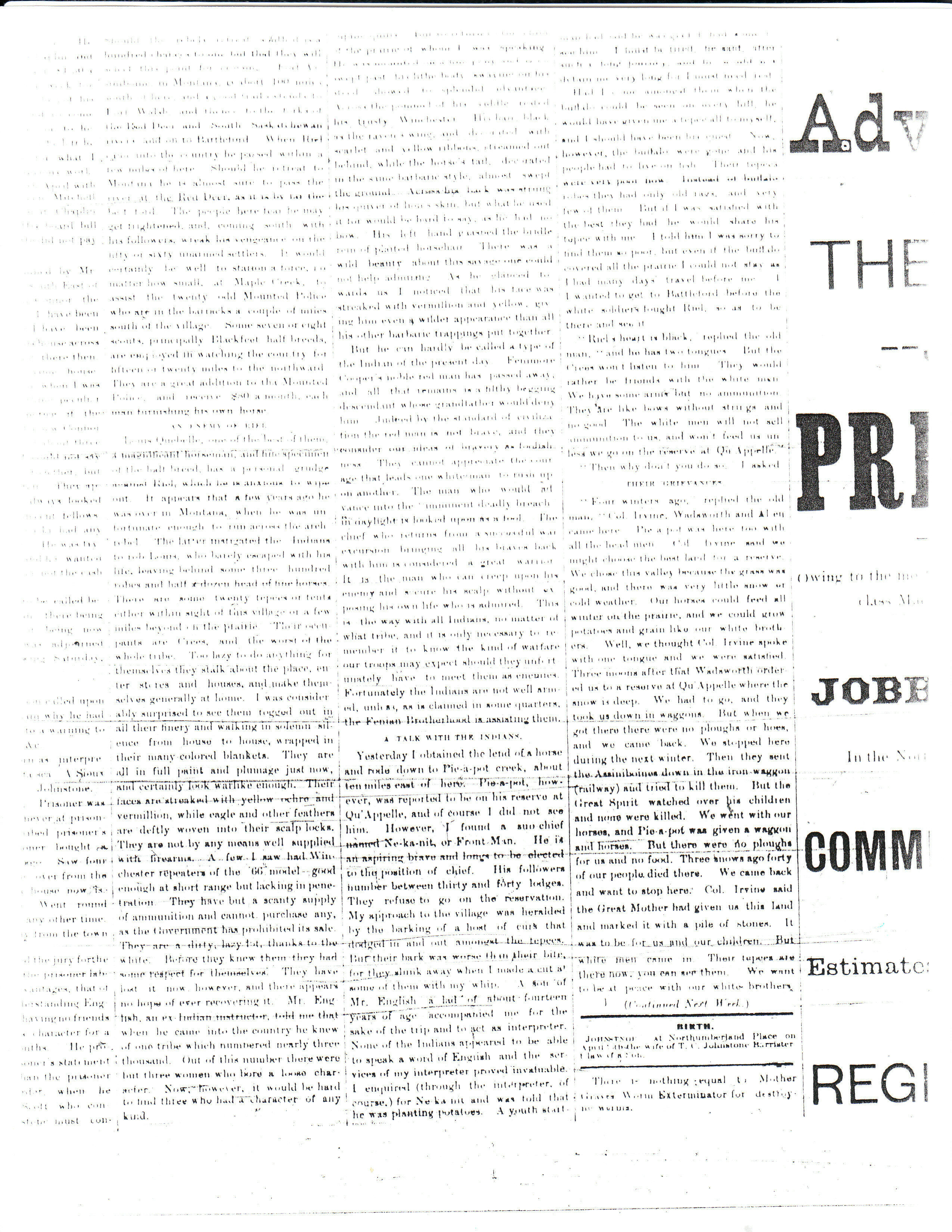 “The reporter of the Leader having received the orders of the proprietor to see Riel before his death and have an interview with him, waited on Captain Deane who was suffering from a severe accident, and who said he would be most happy to oblige the LEADER, but he doubted if he could do so were he in charge, but his superior officer was there, and he had no authority to act without his orders.