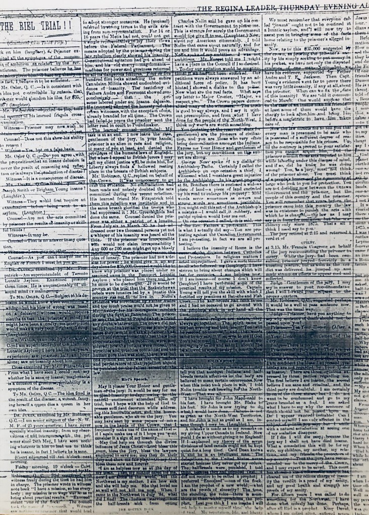 In CASP’s 2010 correspondence with Ed Hird, Hird came forward with information about his great-grandmother Mary McLean, who worked as a reporter for Davin at the Regina Leader and who was also sympathetic to Riel’s cause. According to Hird, “Davin carried on the British tradition of not listing as a byline the names of the reporters who write for the Regina Leader. This was helpful for my great-grandmother Mary in protecting her from arrest by the RCMP when she snuck in disguised as a Roman Catholic priest confessor to obtain an interview with Louis Riel. Mary McLean quotes Davin [as saying] … ‘An interview must be had with Riel if you must outwit the whole police force of the North-West.’ Because Davin protected her anonymity, some writers like C.B. Koester have popularized the myth that Davin … disguised himself as that priest … I spent a week with my late Uncle Don Allen who carefully explained to me about his grandmother’s interview with Louis Riel. ‘When I first saw you [at] the trial, I loved you’ was said by Riel to Mary McLean, not to the man [Davin] calling for his hanging.” For the complete account of this incident in Mr. Hird’s own words, please click here.”
