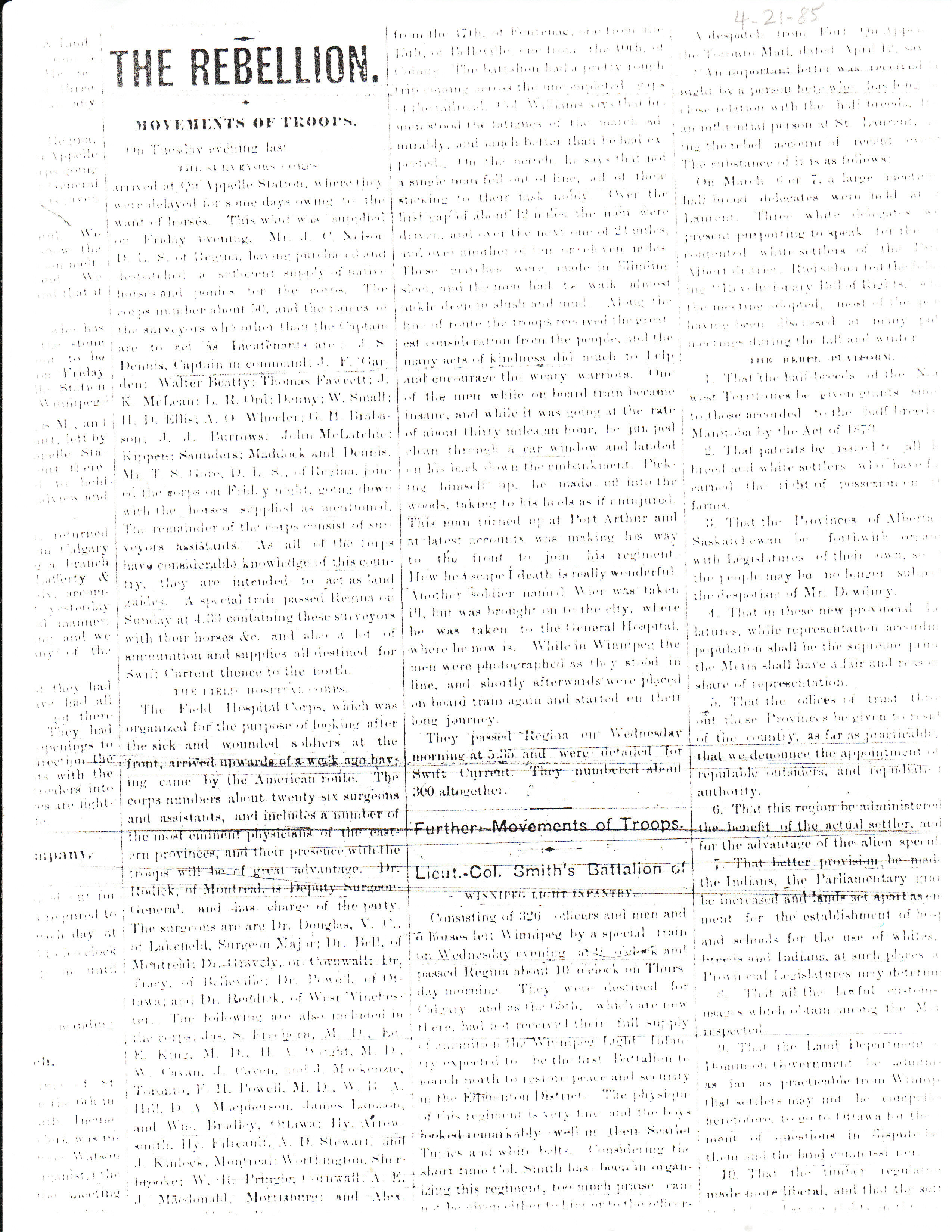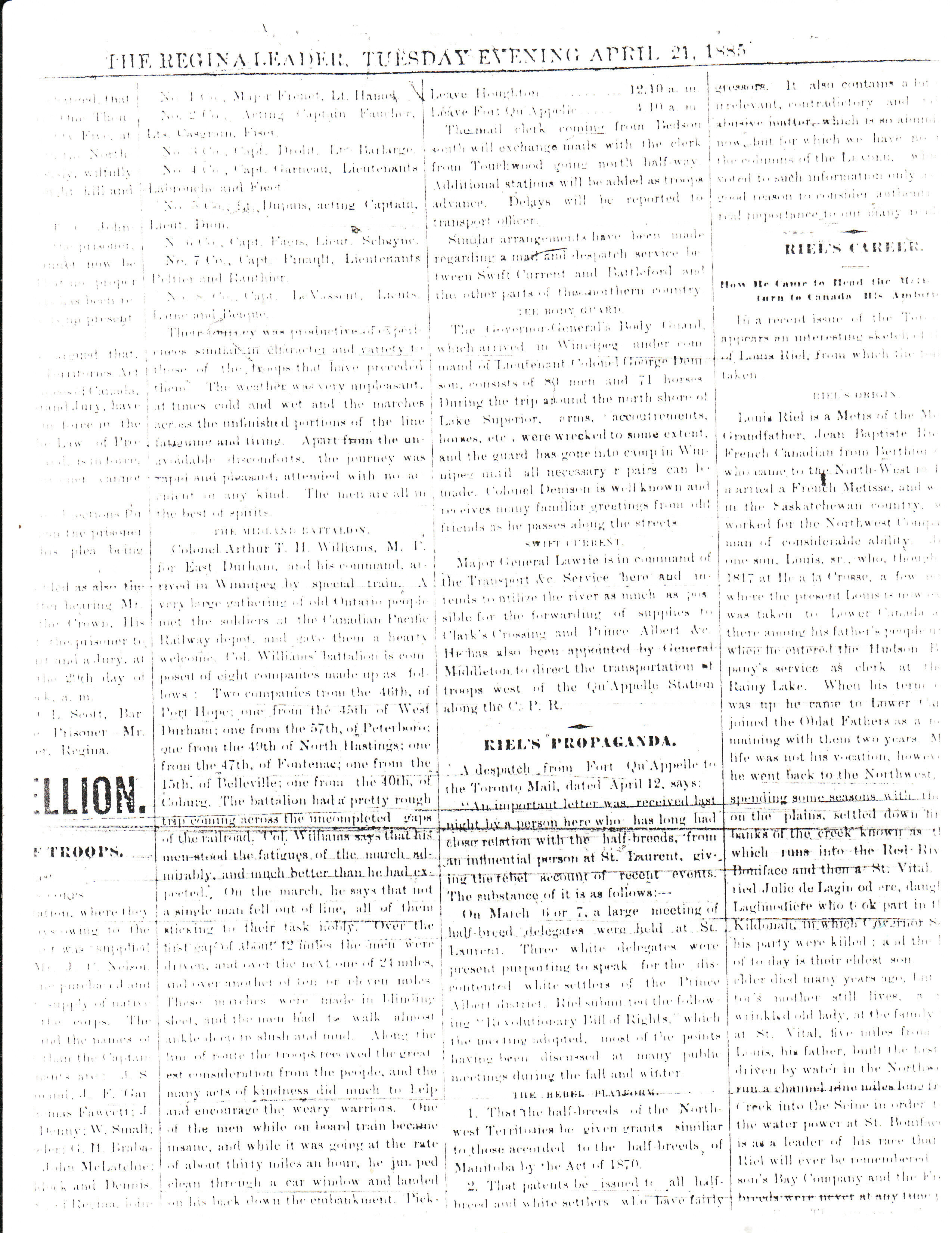 [2] Koester, p. 65, quoting the Daily Regina Leader, “Riel Agitation”, August 15th 1885