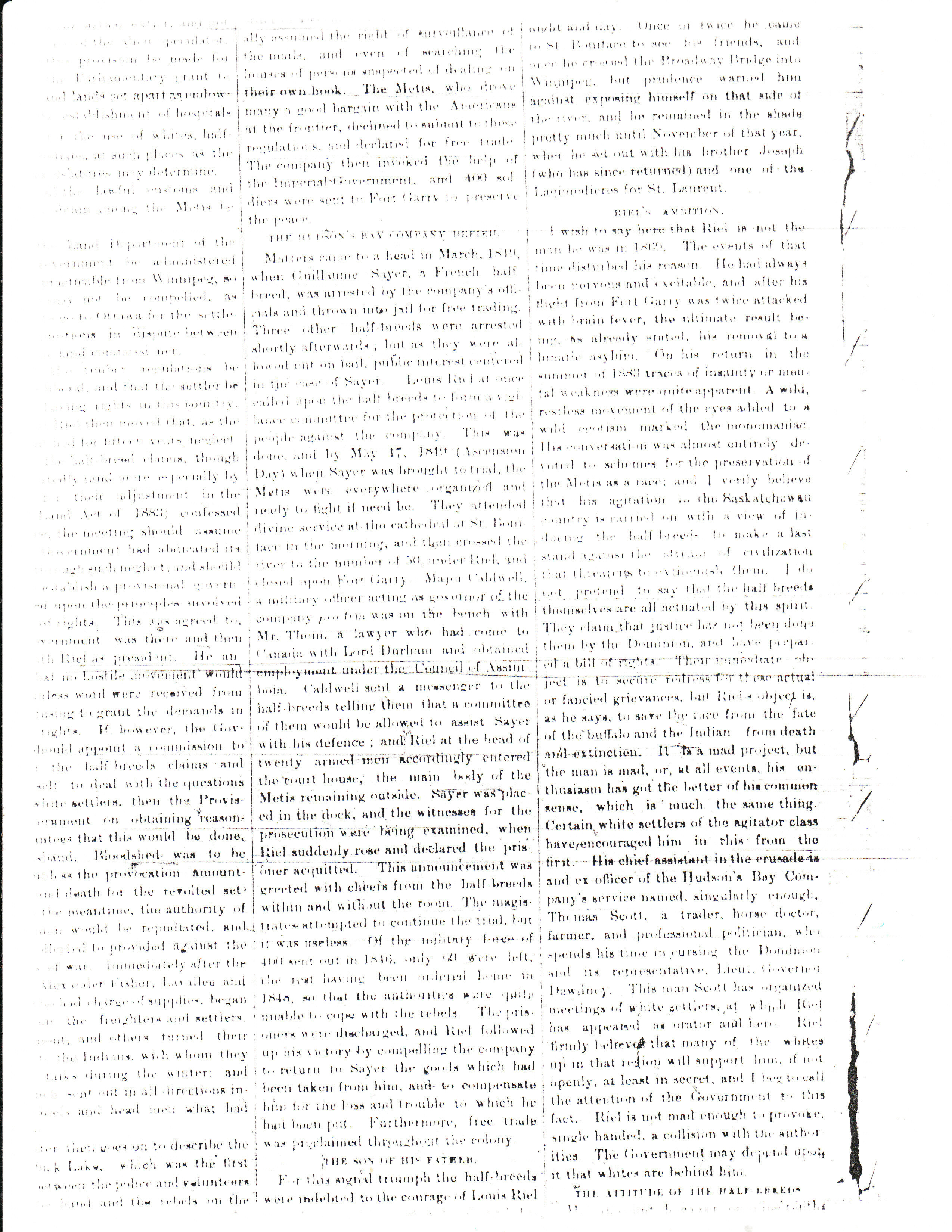 “(…)The Leader merged with another paper, the Regina Evening Post, and continued to publish daily editions of both before consolidating them under the title The Leader-Post. Other newspapers absorbed in due course by the L-P include the Regina Daily Star and The Province.” (note from Ed: Mary appeared to have also worked for the Regina Star before it was absorbed by the Regina Leader-Post); The interview published in the Nov 19th 1885 Regina Leader took place some time during the week preceding Riel’s execution on Monday, Nov 16th 1885. In ‘Execution of Riel’, Saskatchewan Herald (Battleford), Nov 23rd 1885, it is reported that the Nov 19th Regina Leader interview was held two days before the execution. (This corresponds with Louis Riel’s death on Nov 14th 1885)