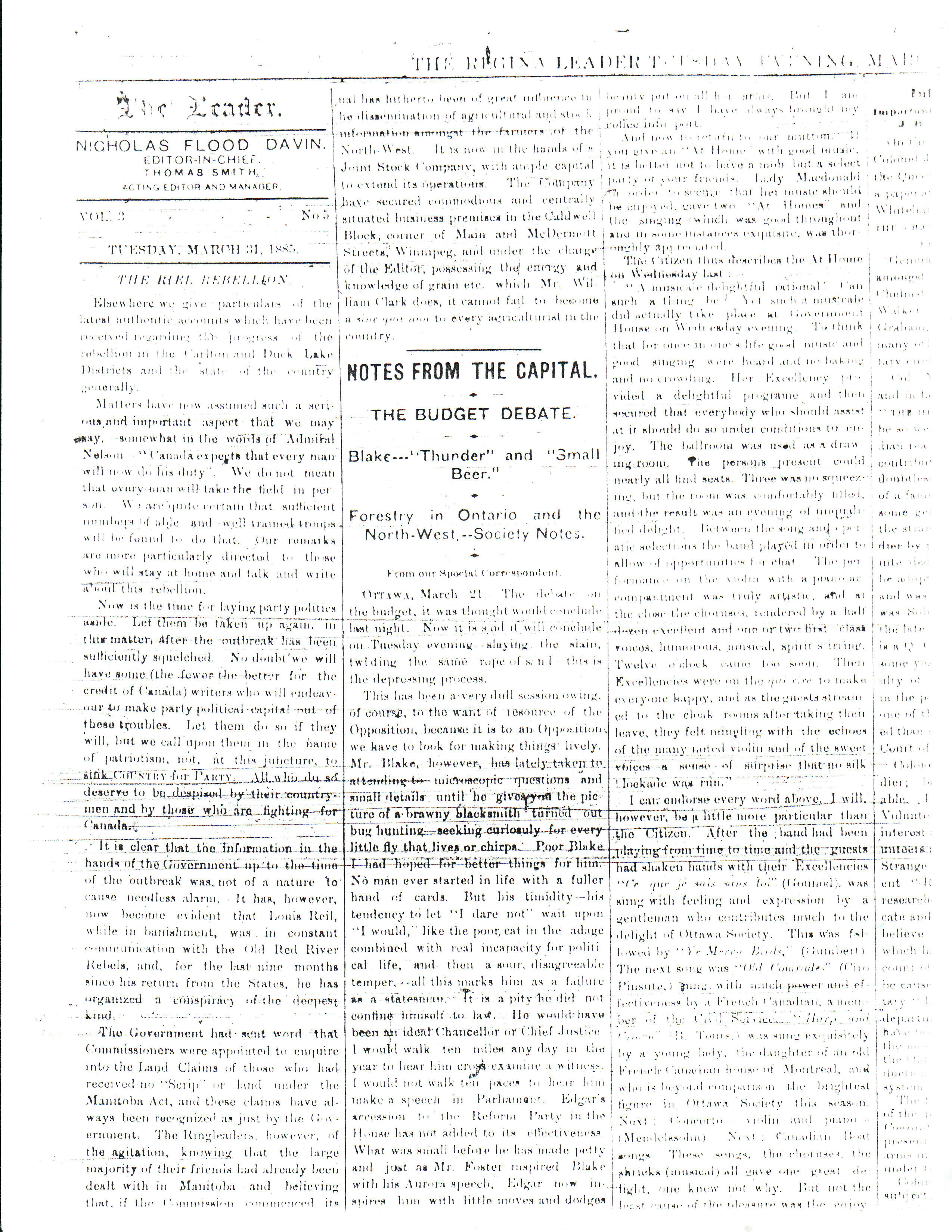 [15] Regina Leader, Nov 19th 1885, http://bit.ly/eitTWy ; In the March 31st 1885 Regina Leader Newspaper, the heading is ‘The Leader, then below it NICHOLAS FLOOD DAVIN, Editor-in-Chief’. http://bit.ly/eUhMU3 In the heading of the Thursday August 6th 1885 Leader newspaper (and every other date of which I have a zeroxed copy), it says “Nicholas Flood Davin, Proprietor and Editor”. http://bit.ly/gZvuBp The evidence is clear that Nicholas Flood Davin, being the proprietor, editor, and Editor-in-Chief, could not be the very reporter whom he commissioned to get the interview.